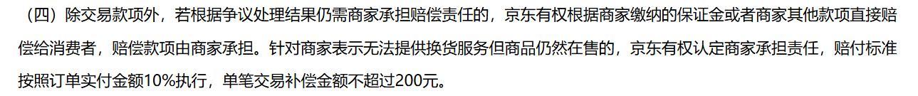 而根据京东开放平台售后服务规则,除交易款项外,若根据争议处理结果仍需商家承担赔偿责任的,京东有权根据商家缴纳的保证金或者商家其他款项直接赔偿给消费者,赔偿款项由商家承担。