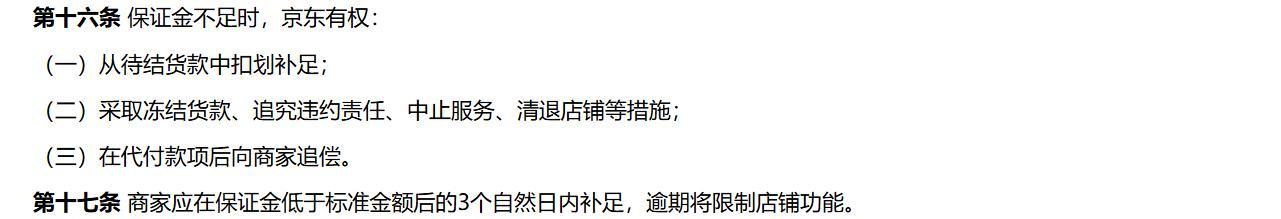 但根据京东开放平台商家保证金管理规则,未足未足额缴纳保证金的,京东有权采取限制货款提现、限制商品发布、限制营销推广功能、搜索推荐降权、限制对应品牌商品上架以及其他必要措施等一项或多项限制。